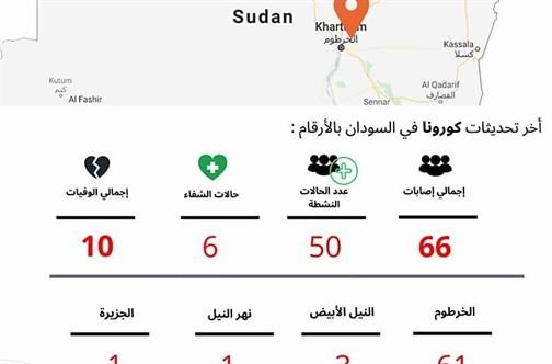 نشرت وزارة الصحة تعميما صحفيا في وقت مبكر من صباح السبت 18 أبريل أكدت فيه ثبوت 30 حالة إصابة جديدة بكورونا ليرتفع العدد الكلي للإصابات إلى 66 منها 61 في ولاية الخرطوم و 3 في النيل الأبيض وحالة واحدة في نهر النيل وحالة واحدة في ولاية الجزيرة وان عدد الوفيات الكلي بكورونا قد وصل إلى عشر حالات.