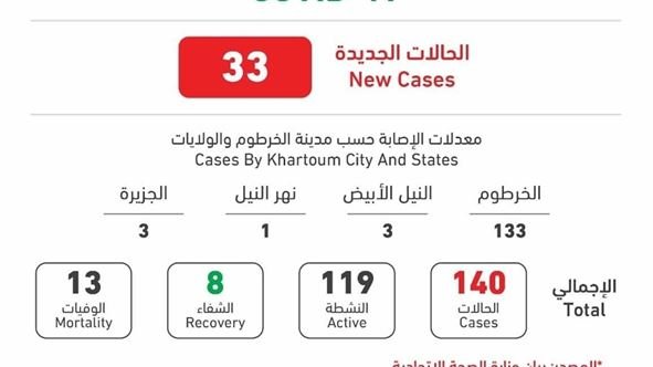 إرتفاع حالات الإصابة بكورونا في السودان إلى 140